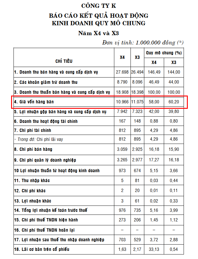 Sử dụng số dư hàng tồn kho cuối năm X2 là 3.025 triệu đồng, số vòng quay năm X3, X4 của công ty K được tính như sau: Số vòng quay của hàng tồn kho năm X3 và năm X4 của Công ty K lần lượt là 4,00 lần và 4,45 lần có nghĩa là bình quân một năm hàng tồn kho mua vào và bán ra trong năm X4 là 4,45 lần trong khi năm X3 chỉ là 4 lần. Từ việc tính Vòng quay hàng tồn kho, ta cũng tính được Số ngày tồn kho của công ty K là: - Trong năm X3: Số ngày tồn kho = (1/4)*365 = 91.25 ngày - Trong năm X4: Số ngày tồn kho = (1/4.45)*365 = 82.02 ngày Điều này cho thấy rằng công ty K bán toàn bộ hàng tồn kho của mình trong khoảng 91 ngày trong năm X3 và 82 ngày trong năm X4. Điều này cho thấy trong năm X4, công ty đã kiểm soát và cải thiện hơn hiệu quả hoạt động của mình. Tóm lại, số vòng quay của hàng tồn kho cao cho thấy rằng: